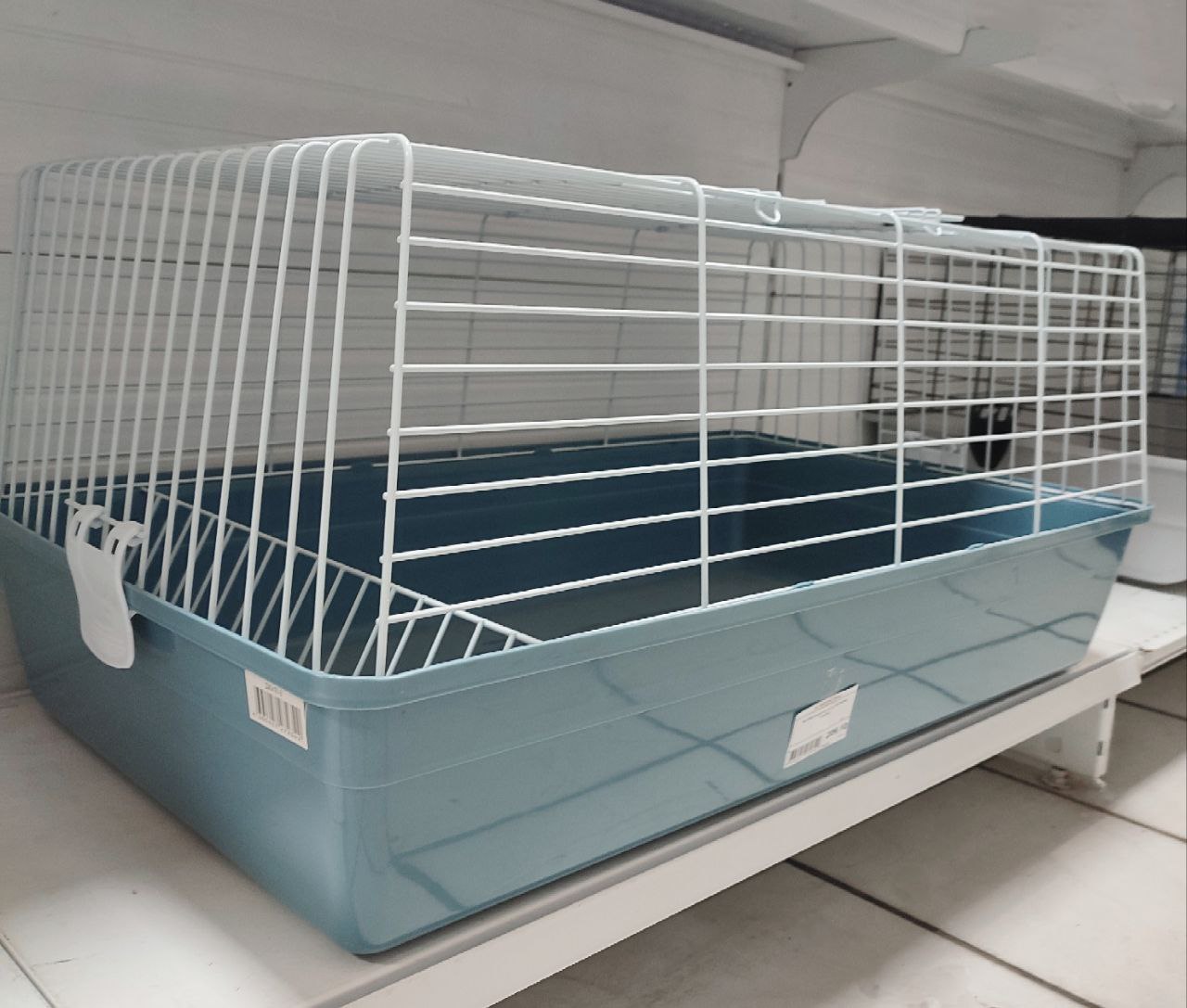 Клетка с пластиковым поддоном и металлическими прутьями. Такая клетка удобна тем, что к ее прутьям можно прикреплять различные полезные атрибуты для грызуна, такие, как поилка, солевой камень и т.д.