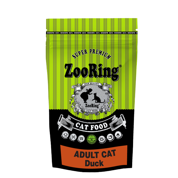 ZooRing Adult Cat (Утка) — полноценный супер-премиум качества сбалансированный сухой корм для молодых и взрослых кошек всех пород. Корм сбалансирован по витаминам, минералам и аминокислотам – укрепляет иммунитет, обеспечивает правильное развитие, отличное пищеварение, крепкие зубы и кости. Содержит таурин (незаменимая аминокислота), необходимый для хорошего зрения, нормального функционирования сердца, головного мозга и периферийной нервной системы, и формулу красоты для шерсти и кожи, которая заботится об экстерьере питомца.