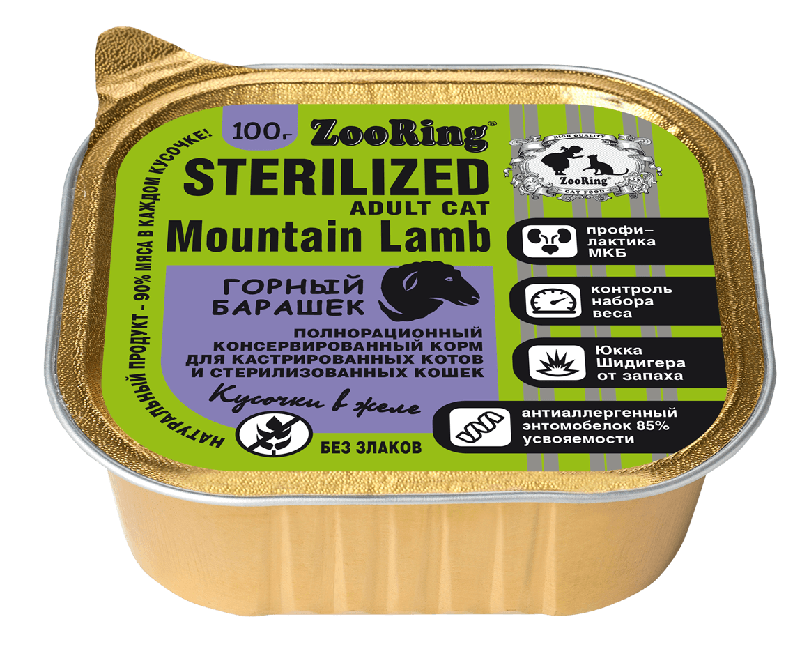 Консервы ZooRing для стерилизованных кошек кусочки в желе с львинкой Горный барашек, 100 гр