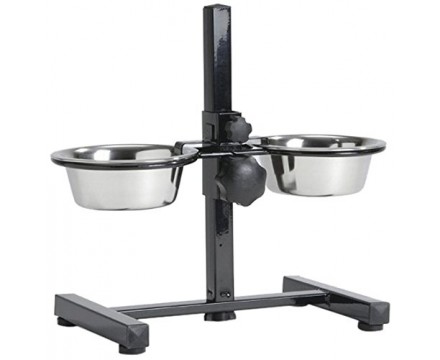 Стойка с мисками. Идеально подойдет для кормления и поения собак мелких, средних и крупных пород. Вы можете настроить нужную высоту в зависимости от размеров вашей собаки. Две миски из блестящего металла на строгой подставке выполнены в неброском минималистичном стиле и станут прекрасным украшением любой кухни или столовой. Материал мисок не навредит здоровью вашего любимца и не изменит вкус его обеда, потому что не вступает ни в какие реакции с пищей или водой. Устойчивая подставка не даст мискам опрокинуться, а любимцу гонять кормушку по всей комнате как это часто бывает с обычными мисочками.