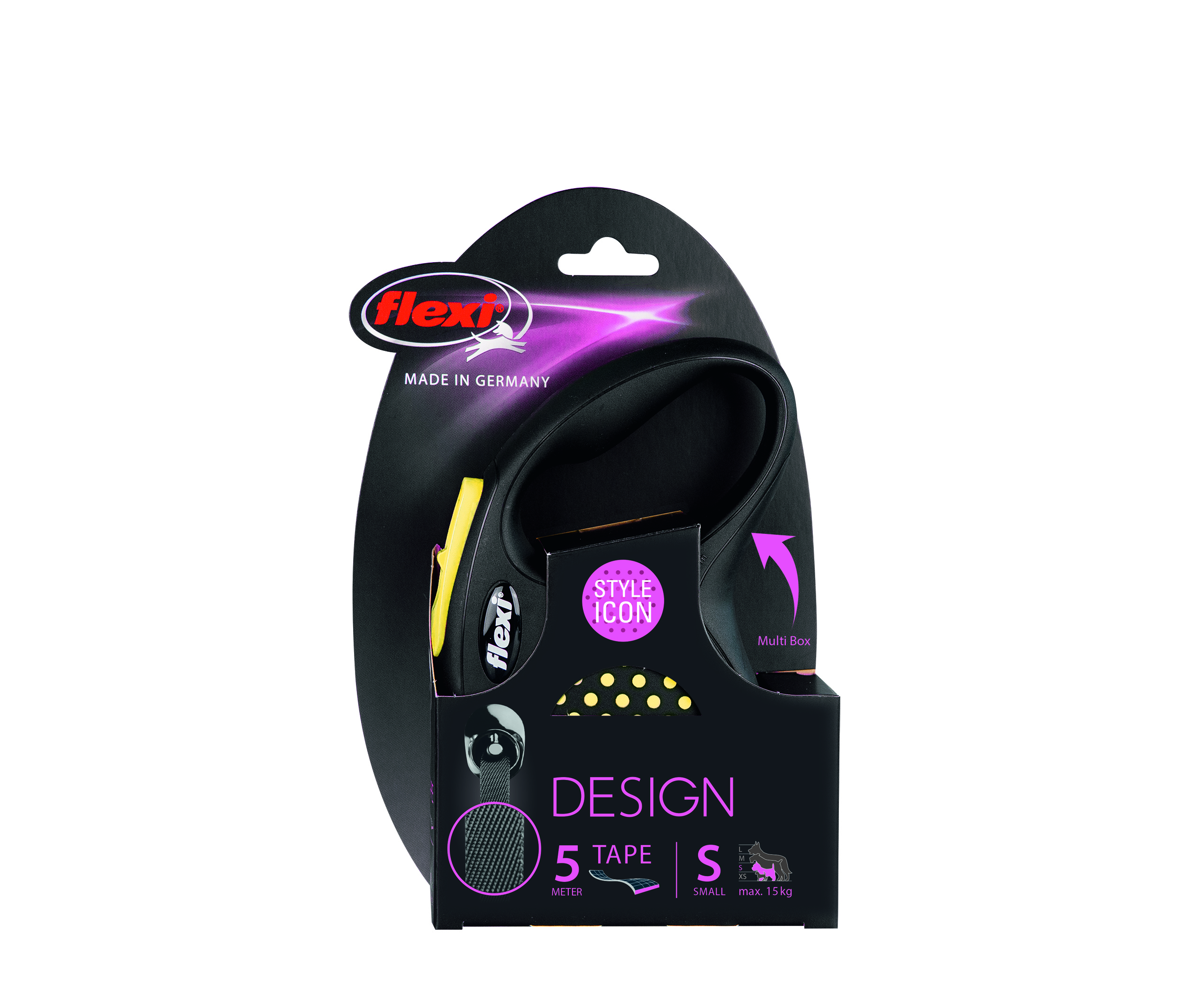 Поводок-рулетка "Flexi", "DESIGN" желтая 15кг/5м- поводок ременной-хромированная застежка-тормозная система с укороченной длинной хода-вес поводка: прибл. 190 г.-возможность дополнения Multi Box.-вес поводка: прибл. 190 г.