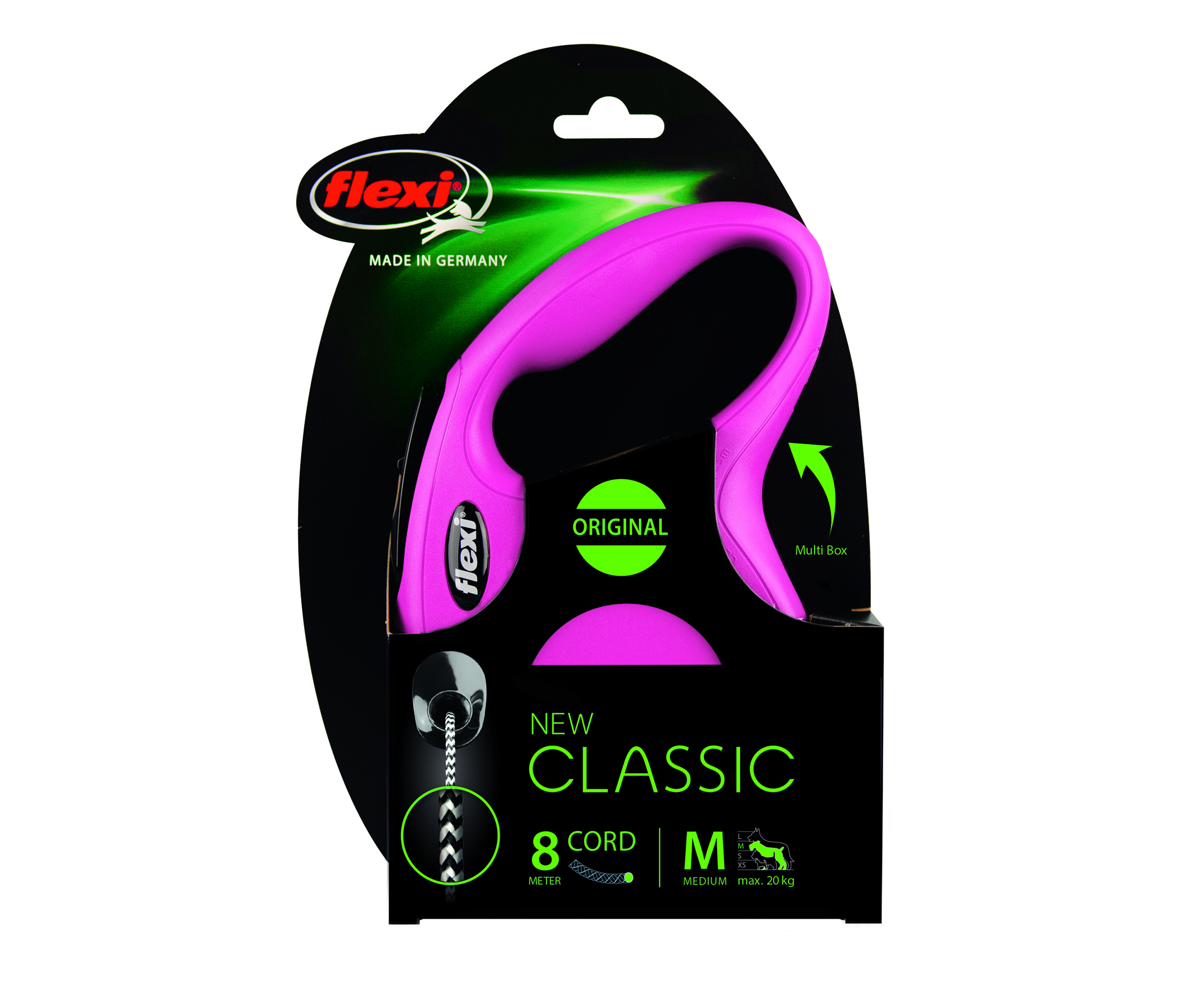 Поводок-рулетка "Flexi", "New CLASSIC ", розовый, (S) до 12кг/8м -тросовый поводок длиной 8 м -для собак весом до 12 кг -светоотражающие элементы -хромированная застежка -тормозная система с укороченной длинной хода -вес поводка: прибл. 320 г. -возможность дополнения VARIO LED Lighting System -возможность дополнения Multi Box
