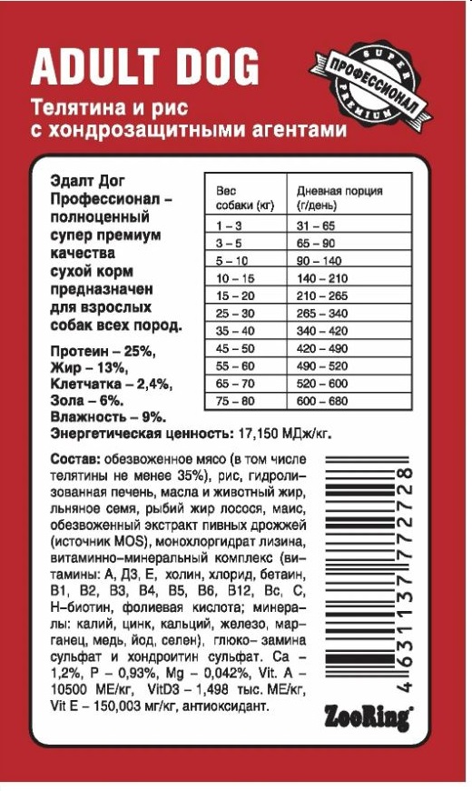 ZooRing Adult Dog (Телятина, рис) 2 кг, Сухой корм для взрослых собак средних и крупных пород